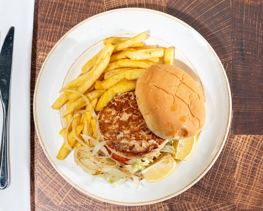 5oz Fresh ground salmon, topped with fixings of your choice, served with Crispy French fries