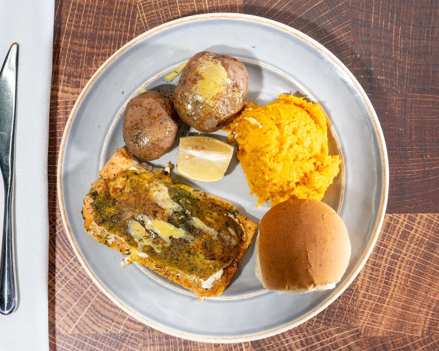 10oz of fresh fish broiled to perfection in our house garlic butter sauce, served with two veggie sides of your choice
