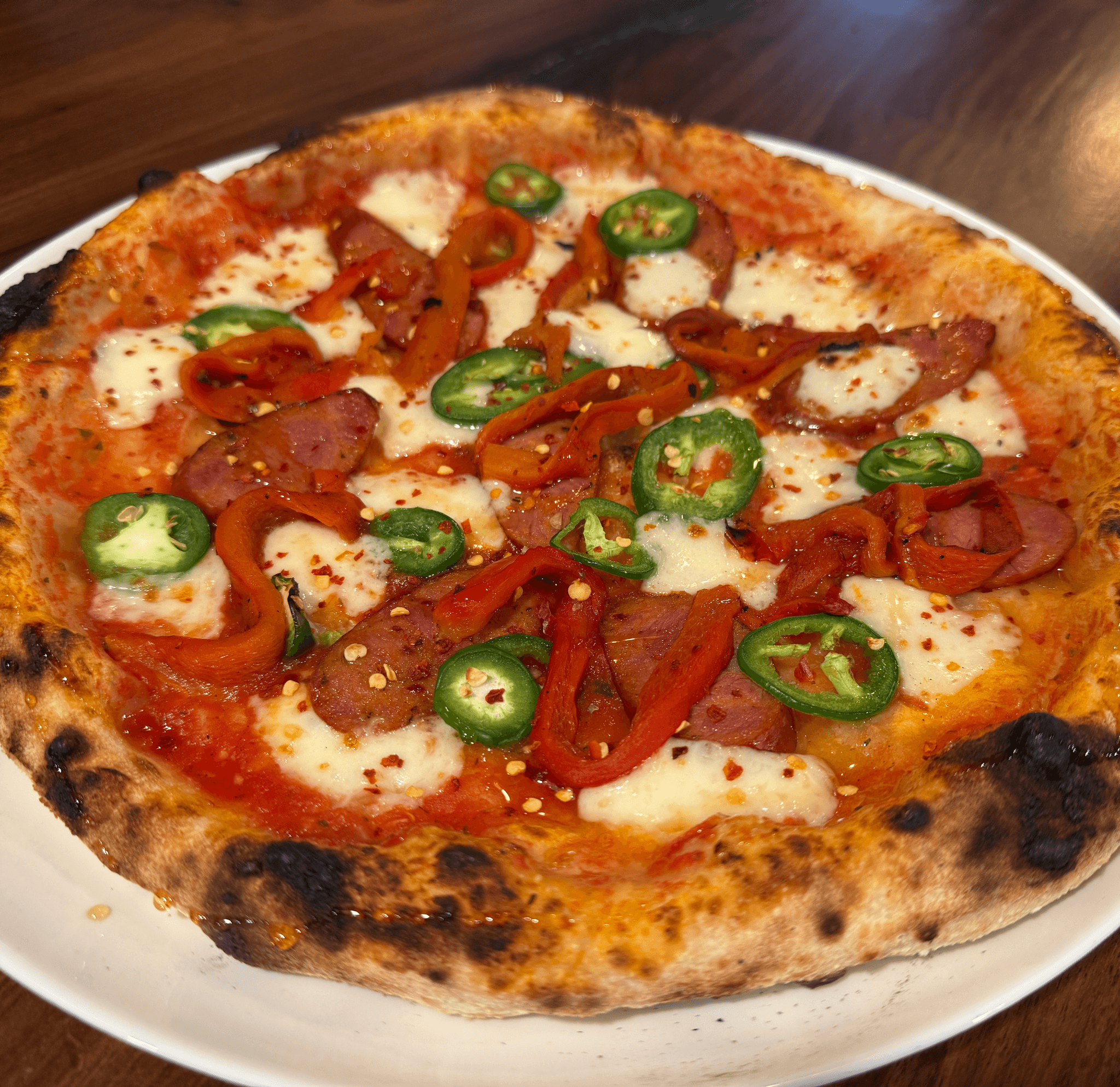 House Tomato Sauce, Fresh, Mozzarella, Andouille Sausage, Fresh Jalapenos, Roasted Red Peppers, Finished with crushed chili flakes and Hot Honey.