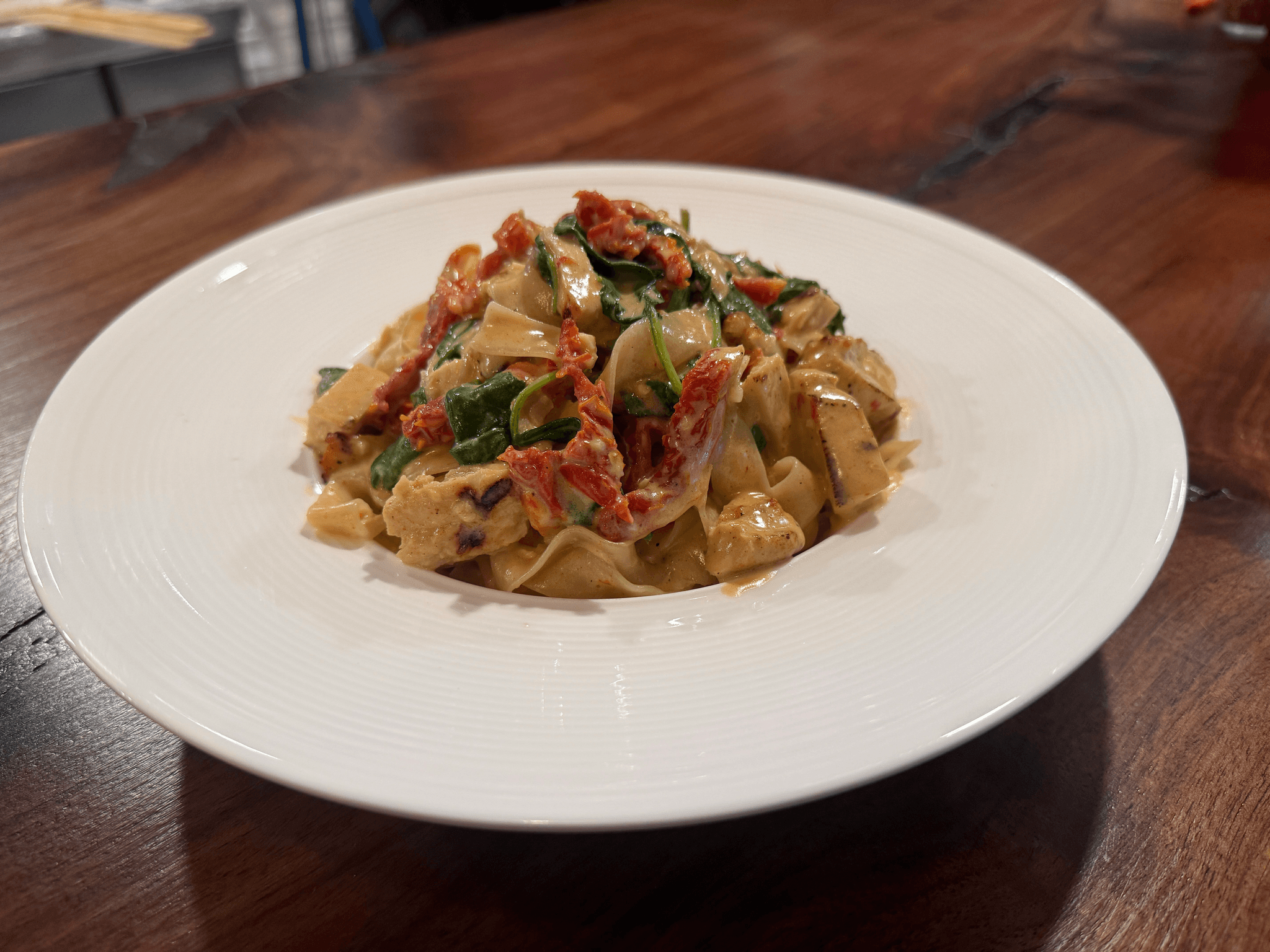 Chicken, creamy white sauce, garlic, fresh spinach, and sun-dried tomatoes, tossed with fettuccine pasta.