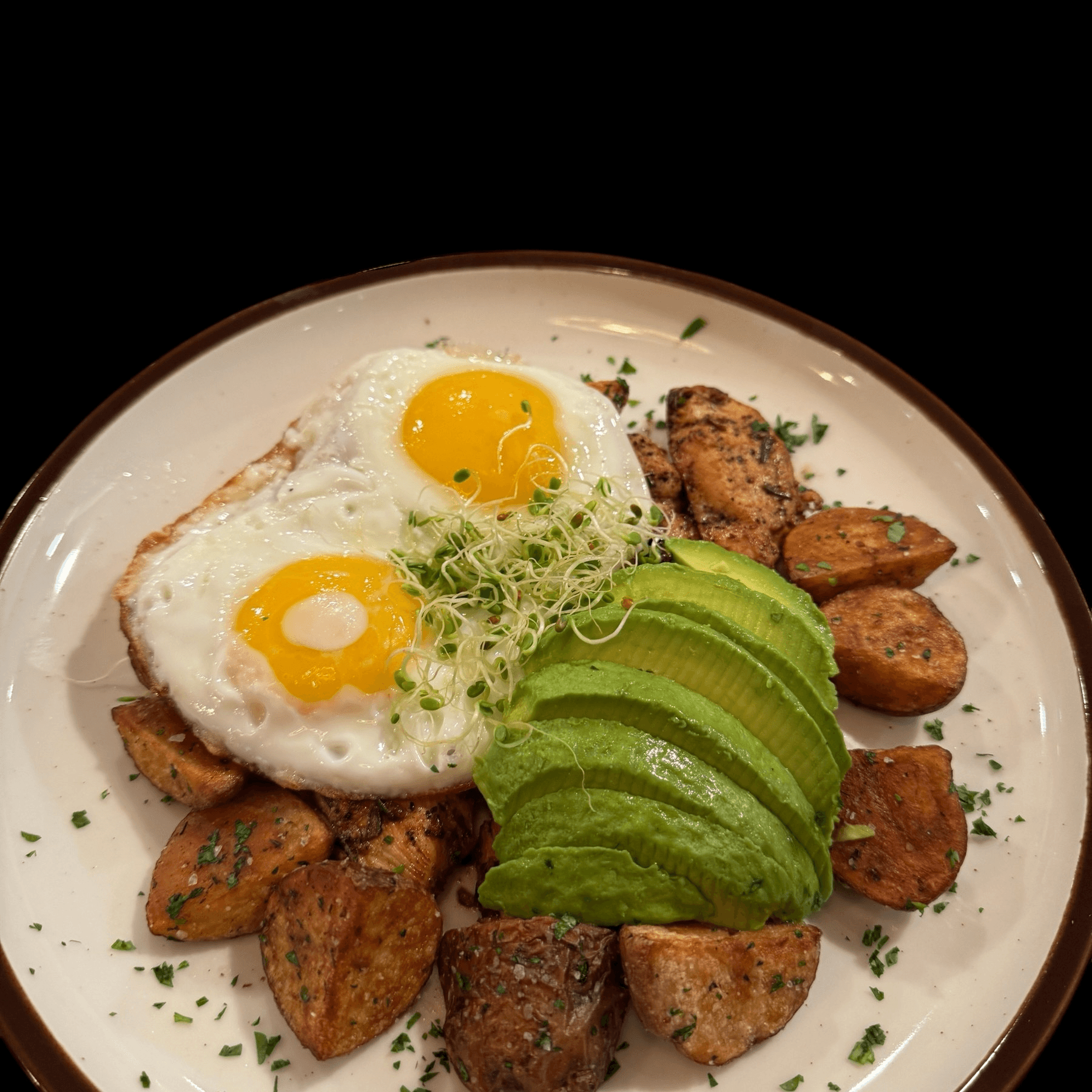 Two Eggs, Grilled Breast Chicken, Avocado, Home Potatos