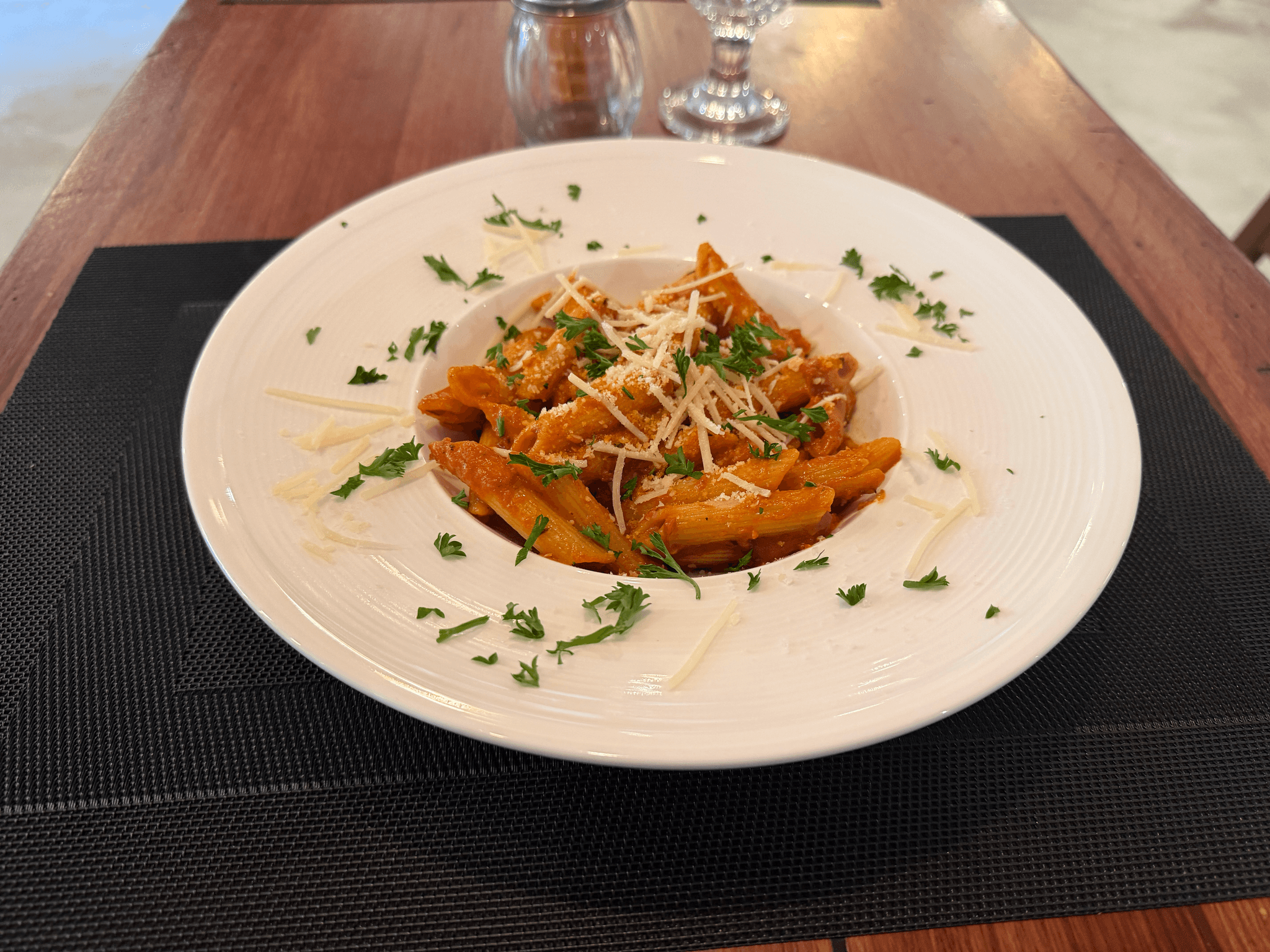 Creamy tomato-vodka sauce, garlic, basil, spice, tossed with penne and Parmesan .