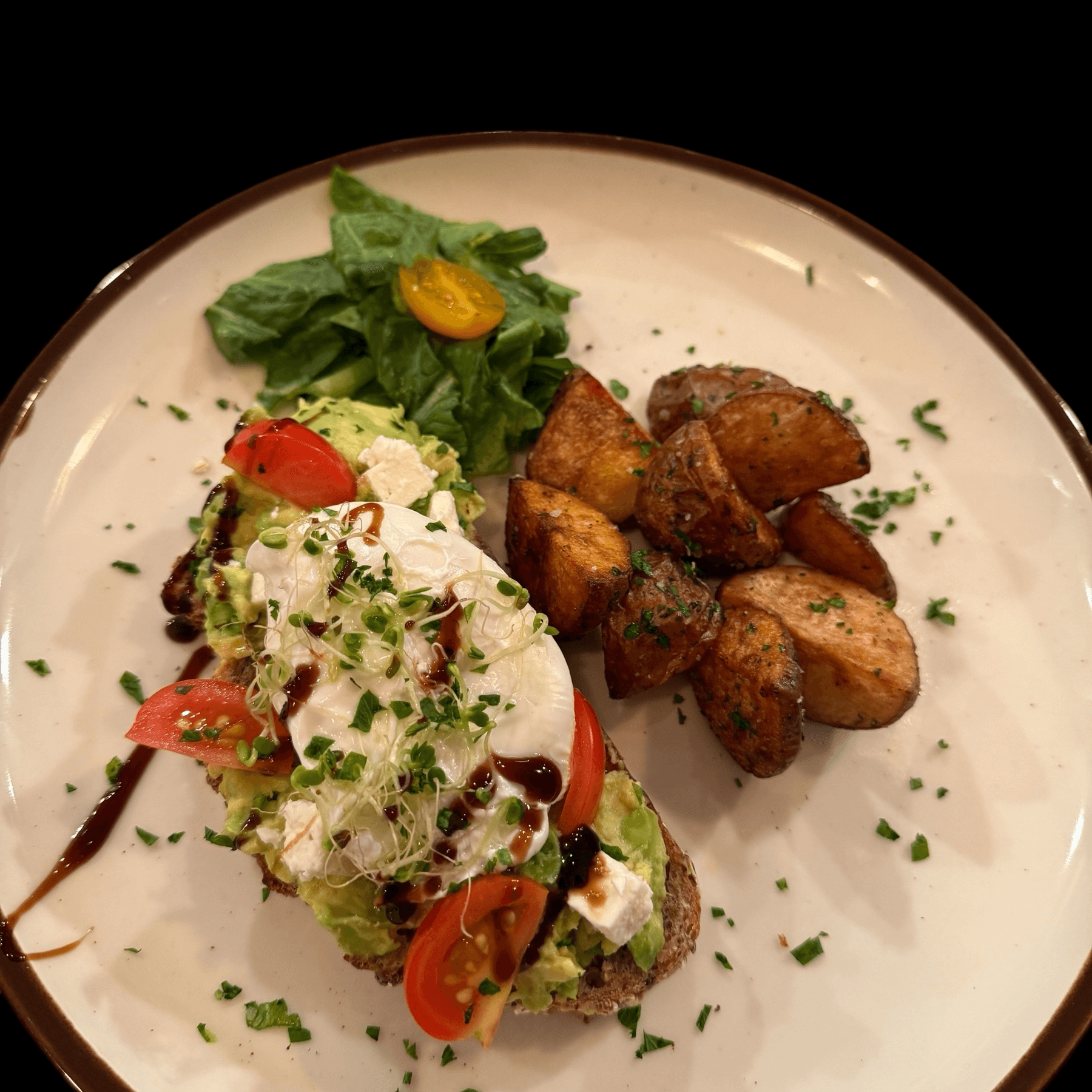 Organic Multigrain Bread, Poached egg, Feta Cheese, Cherry Tomatoes, Fresh Basil, with a Balsamic Glaze Drizzle served w/ Home Potatos * choose of Burrata cheese instead of Poached Egg *