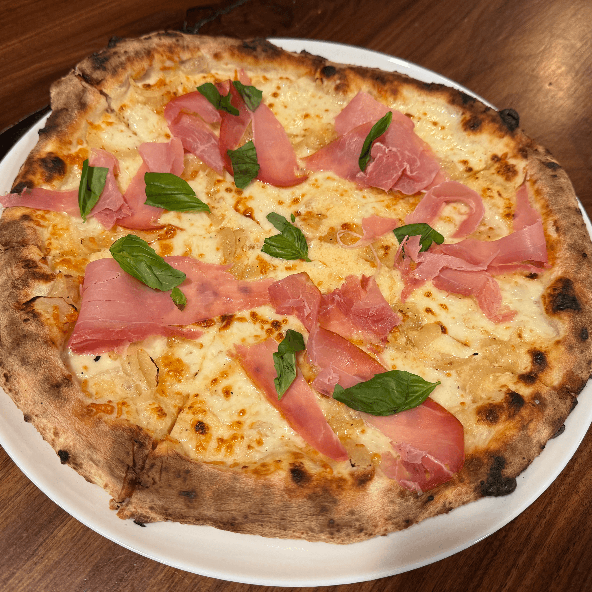 White sauce, fresh mozzarella, grana padano, prosciutto, roasted onions, basil