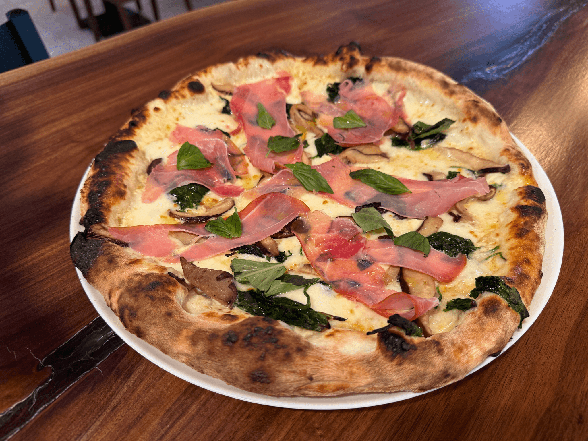 White sauce, fresh mozzarella, feta, mushrooms, spinach, prosciutto, basil, olive oil