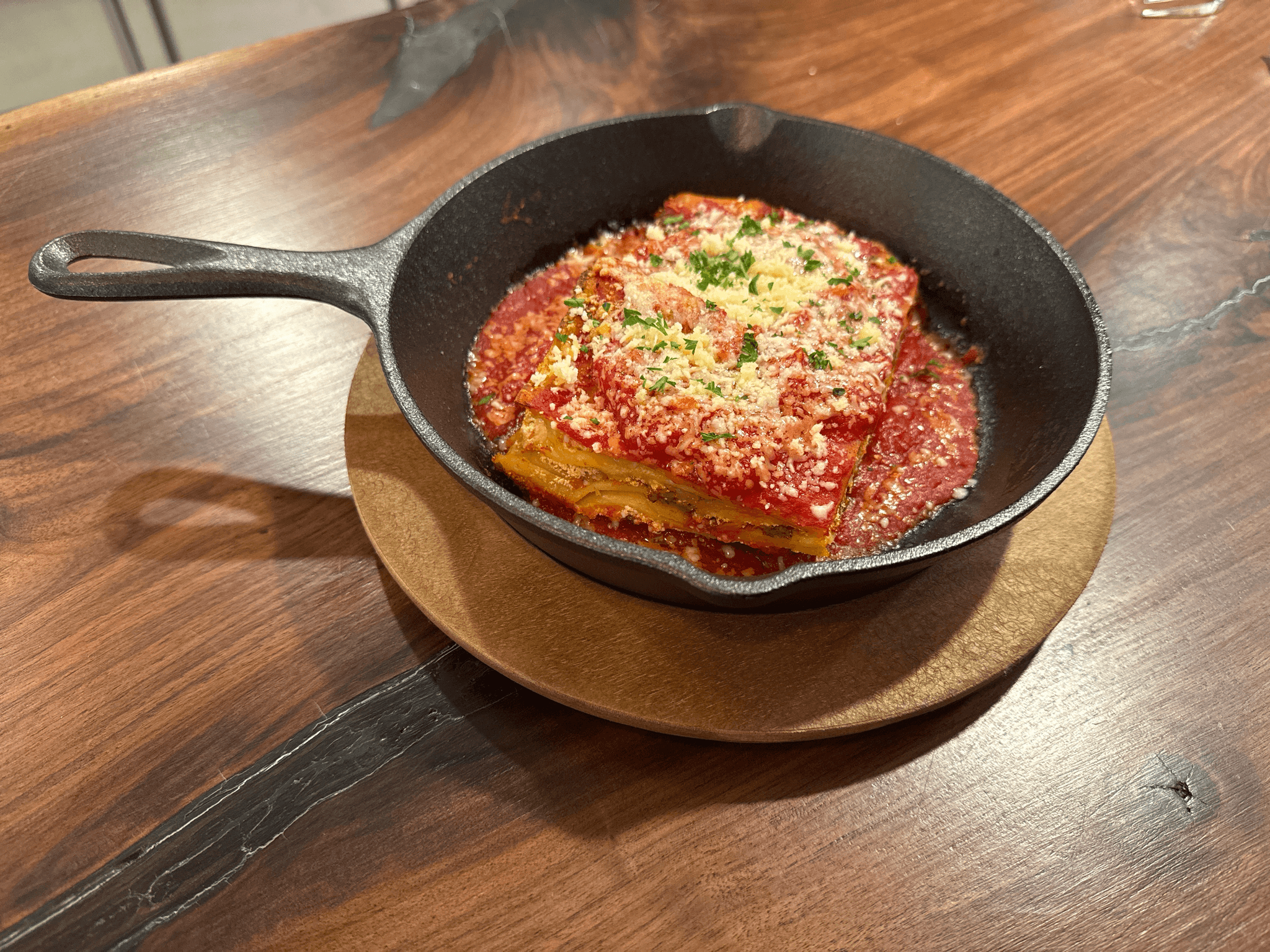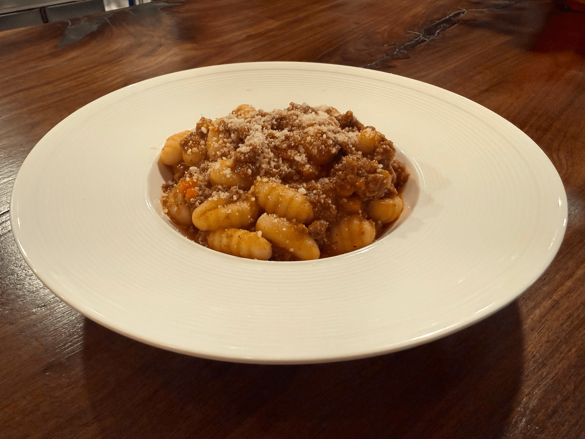 Hand cut beef, vegetables & marinara, house blend cheese, fonduta, Parmesan