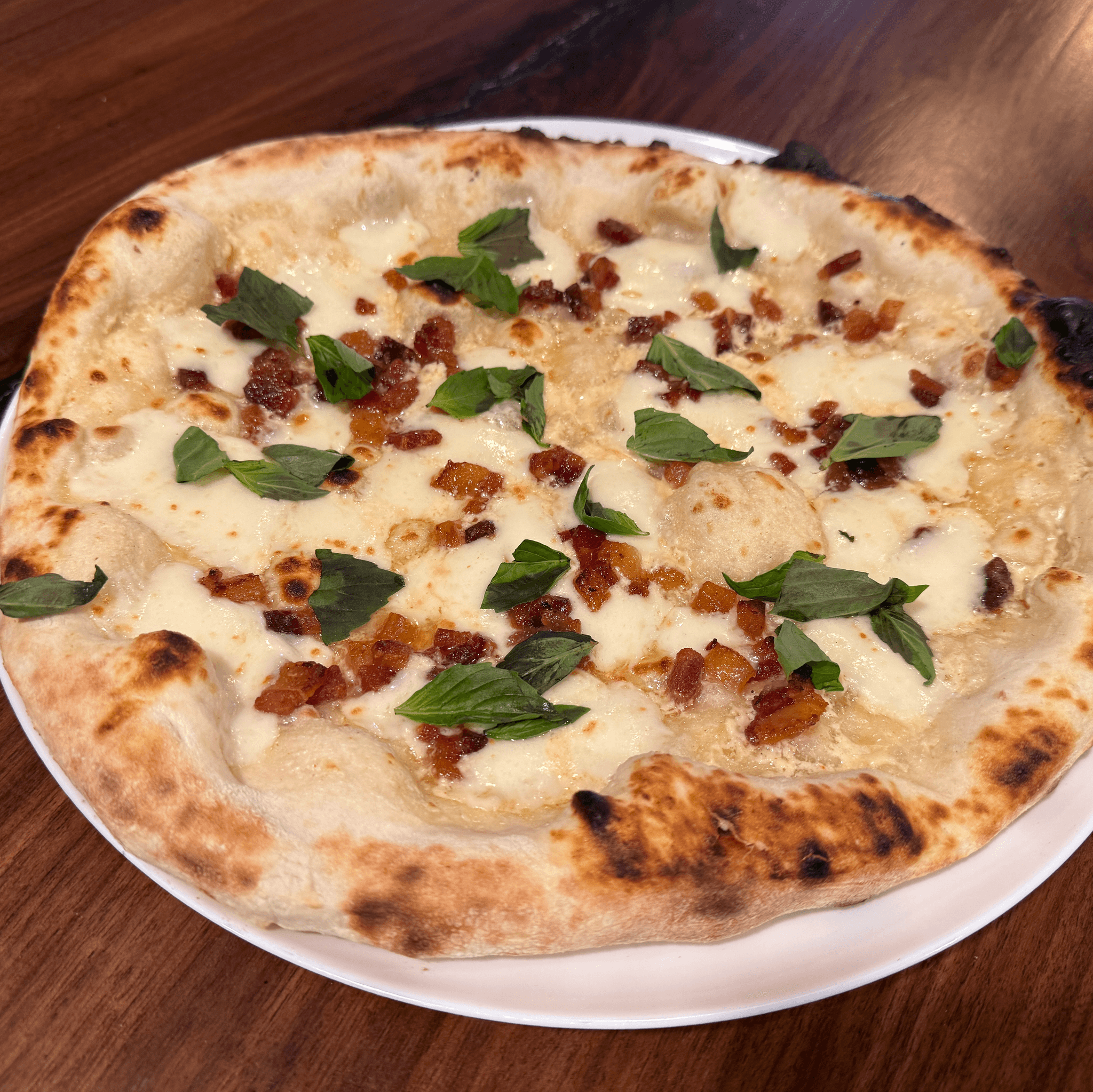 White sauce, fresh mozzarella, Baker's bacon, Pecorino, basil