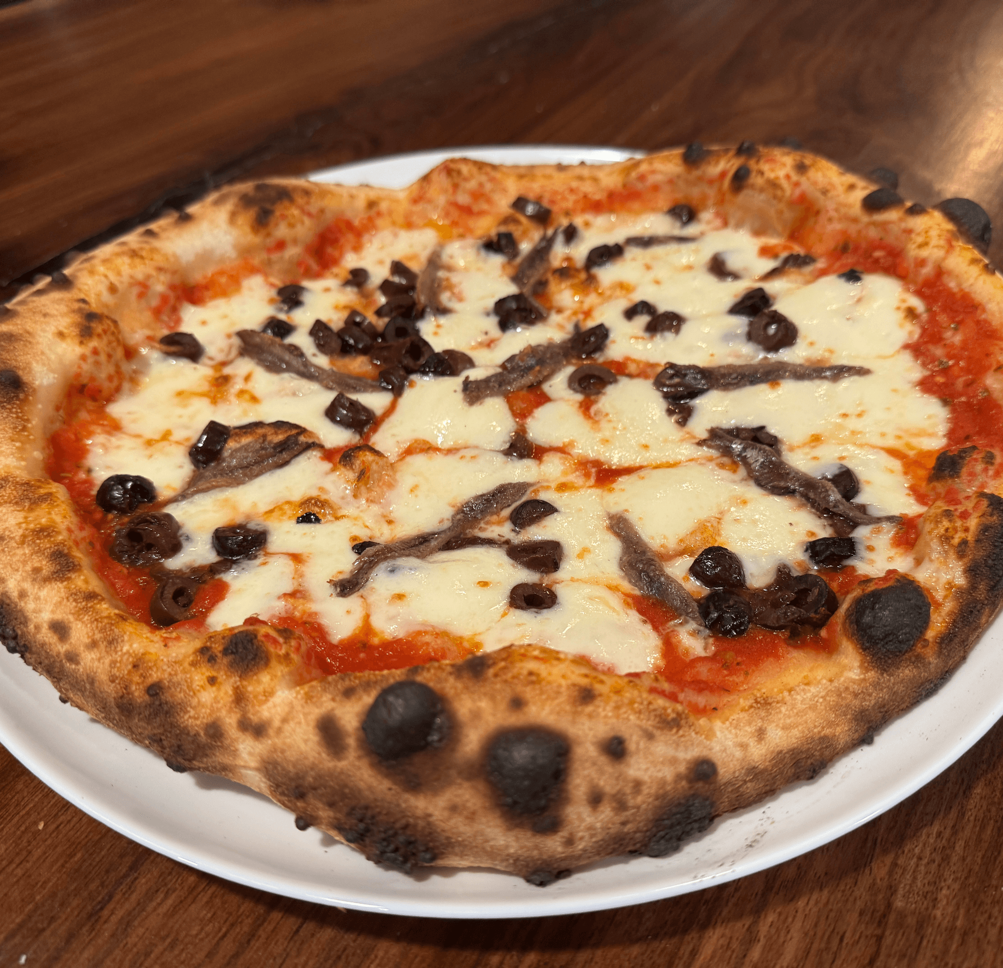 Fresh Mozzarella, Anchovy, Kalamata olives, basil.