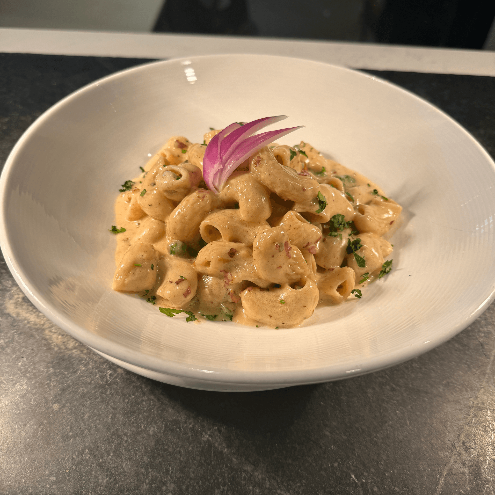 Sweet peas, onions, garlic, prosciutto di Parma, Parmesan cream, tossed with macaroni