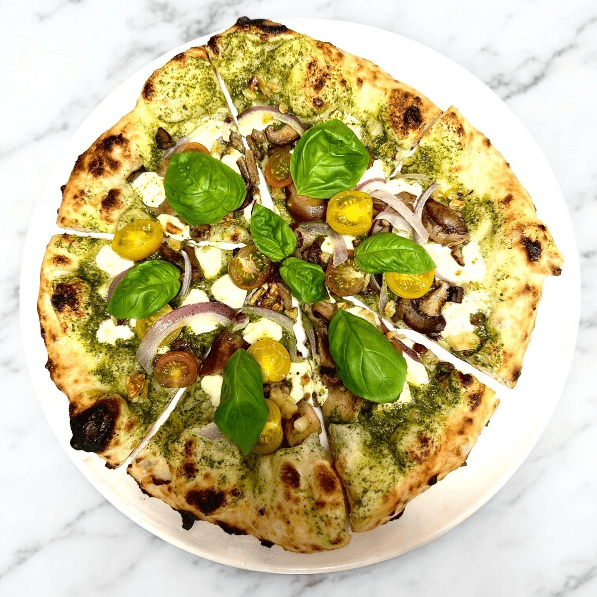 Pesto Sauce, Fresh Mozzarella, Mushrooms, Red Onions, Garlic, Cecca Tomato.