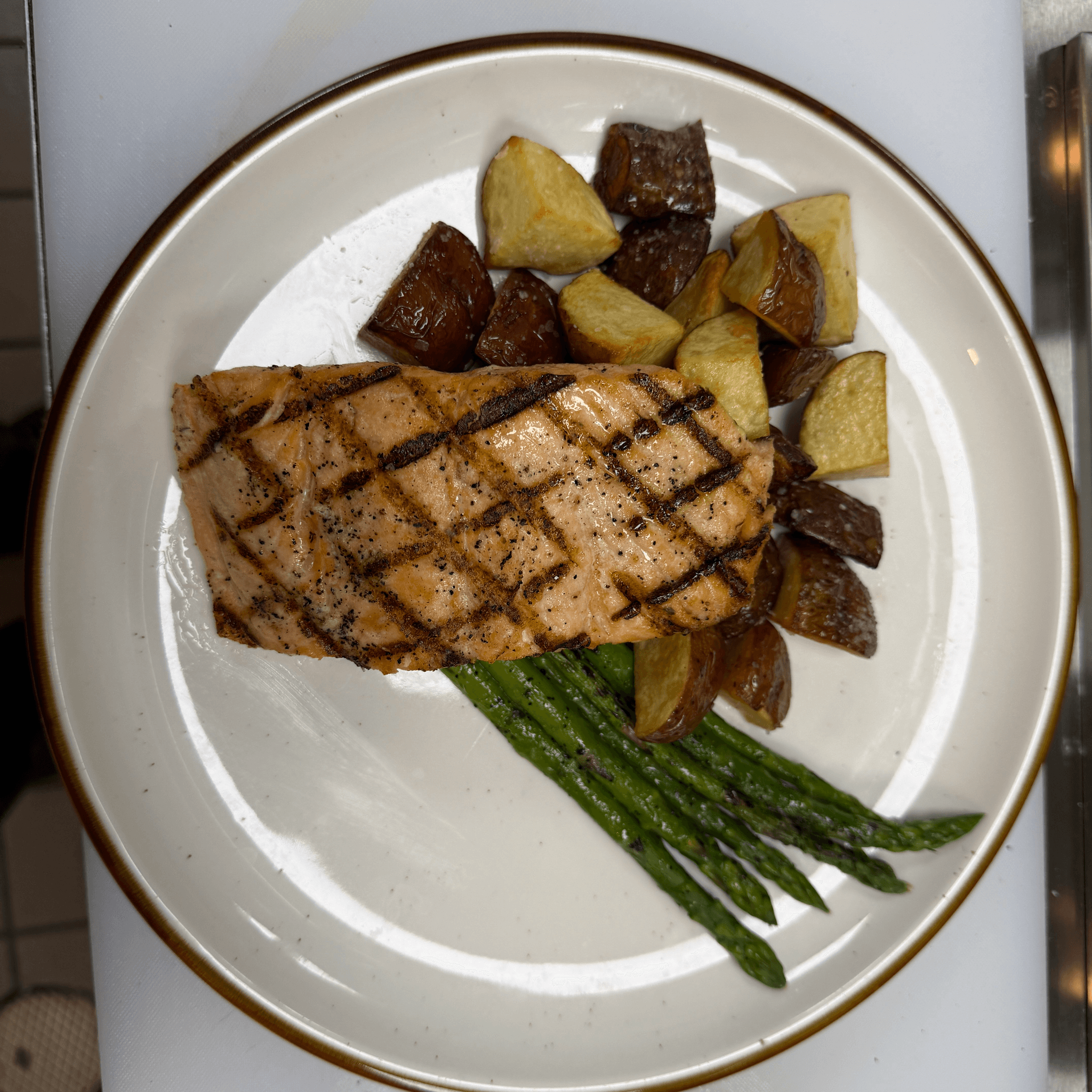 Grilled atlantic salmon, grilled asparagus,roasted potatoes.