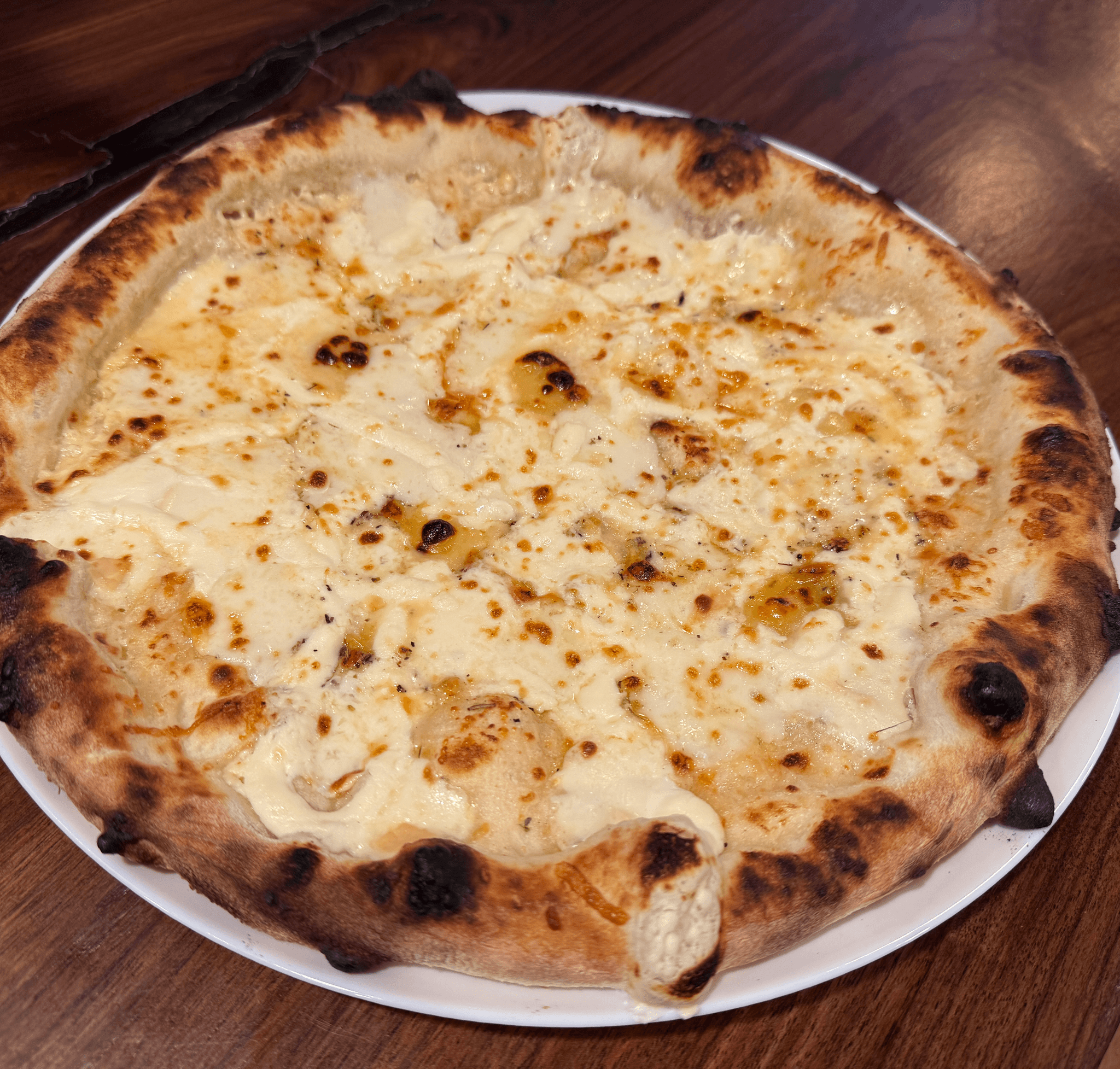 White Sauce, Smoked Mozzarela, Fresh Mozzarella, Ricotta, Grana Padano, Olive oil