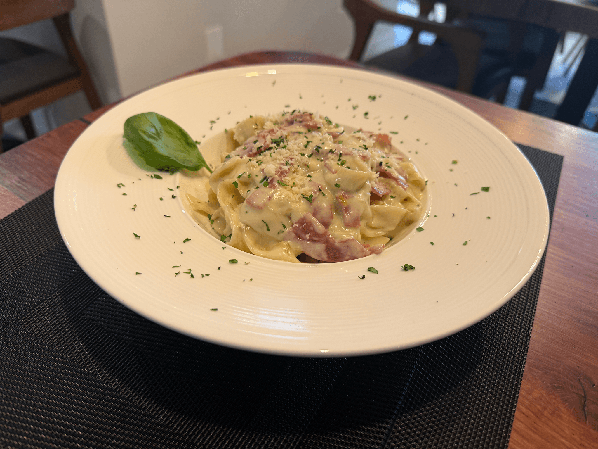 Italian cured salami, Smoked Gouda, Parmesan cream, and fresh fettuccine