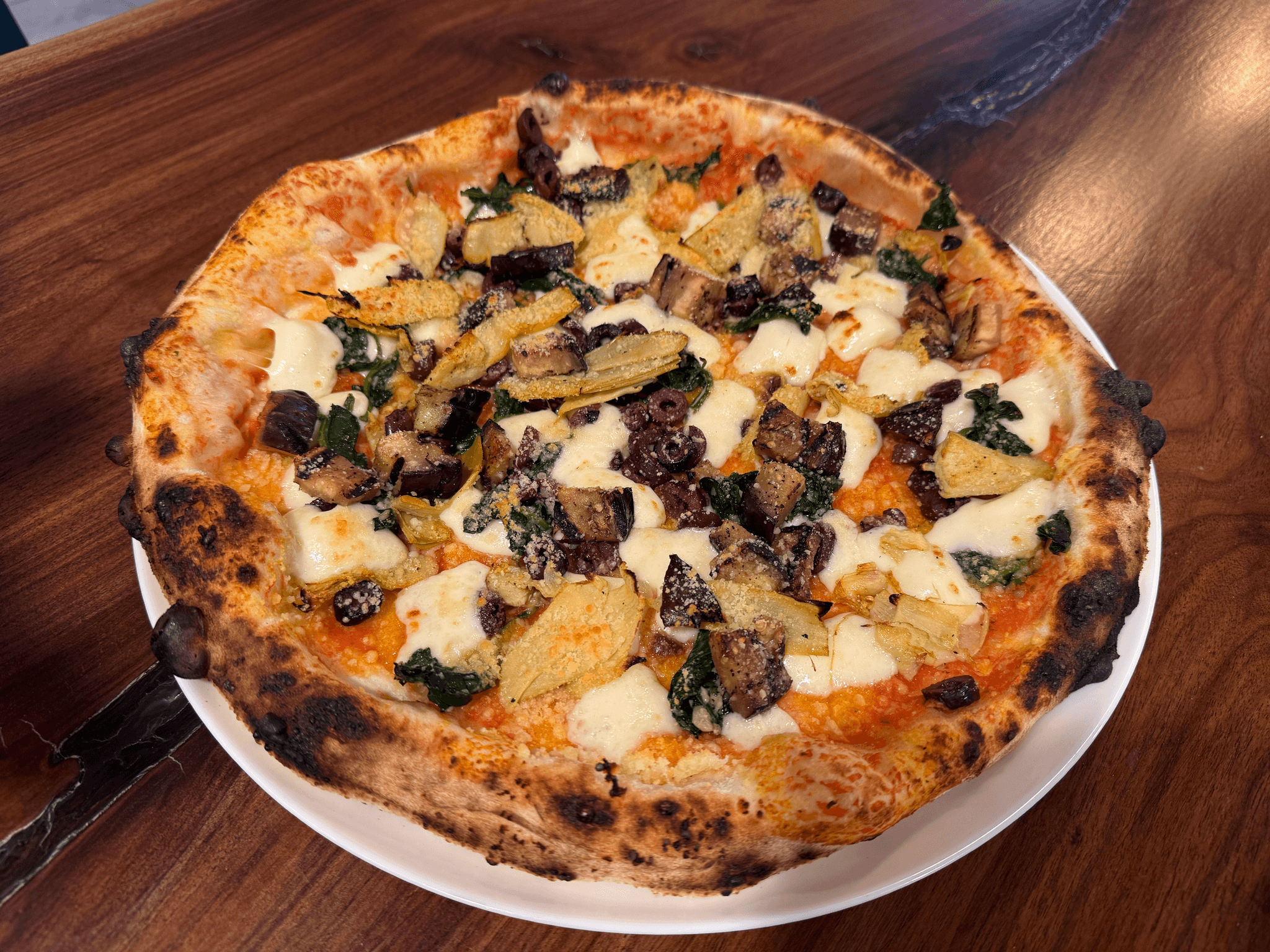 House Tomato Sauce or White Sauce, House Blend, Grana Padano, Spinach, Olives, Artichoke, Eggplant