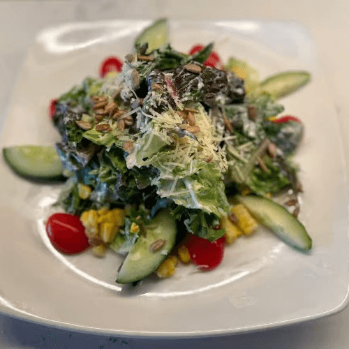 Mixed greens, tomatoes, cucumbers, corn, sunflower seeds, asiago, peppercorn ranch.