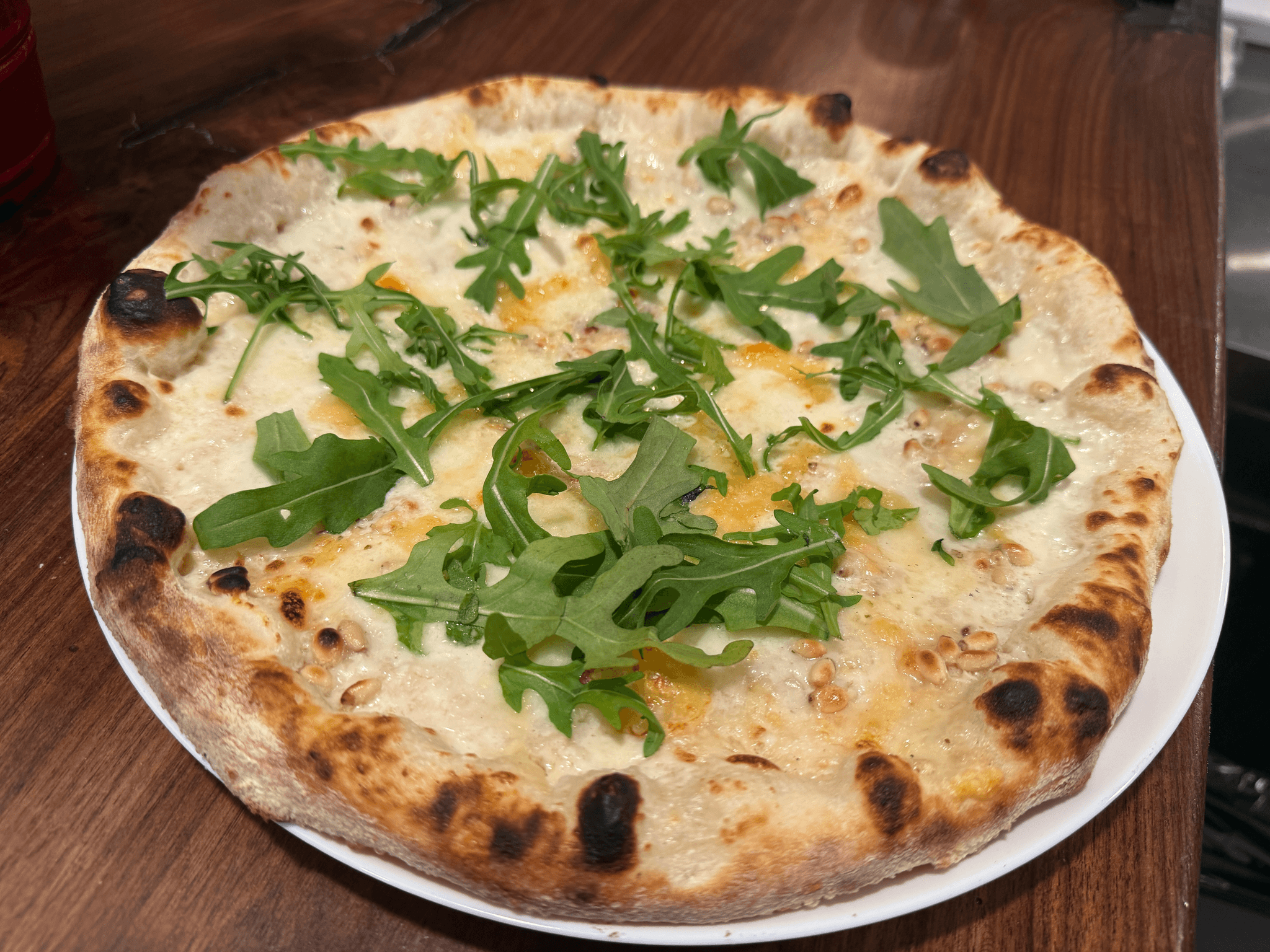 White Sauce, Buffalo Mozzarella, Shaved Parmesan, Pine Nuts,Baby Arugula.