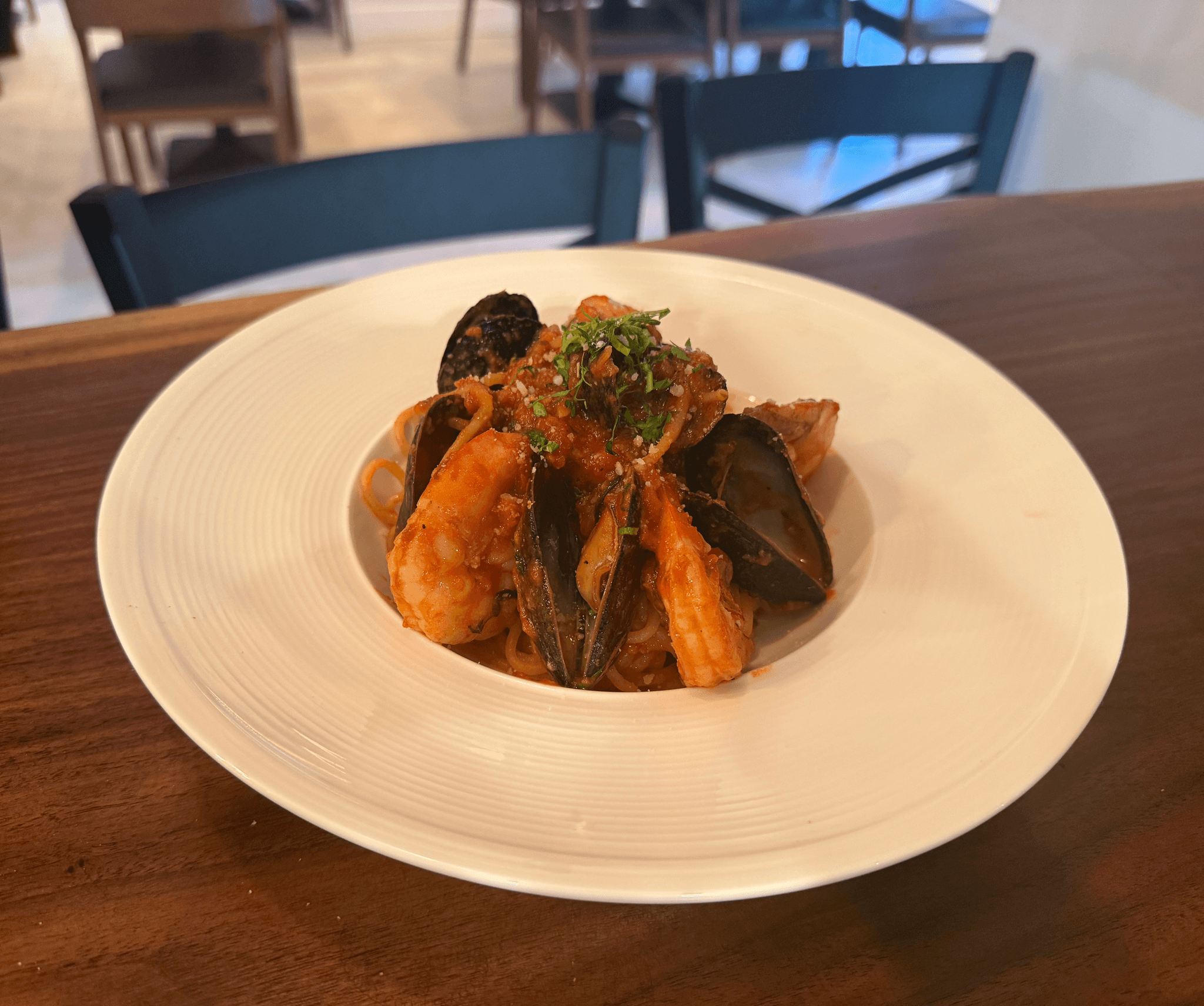 Arrabbiata sauce with sautéed shrimp, mussels, garlic, and onions, tossed with spaghetti.