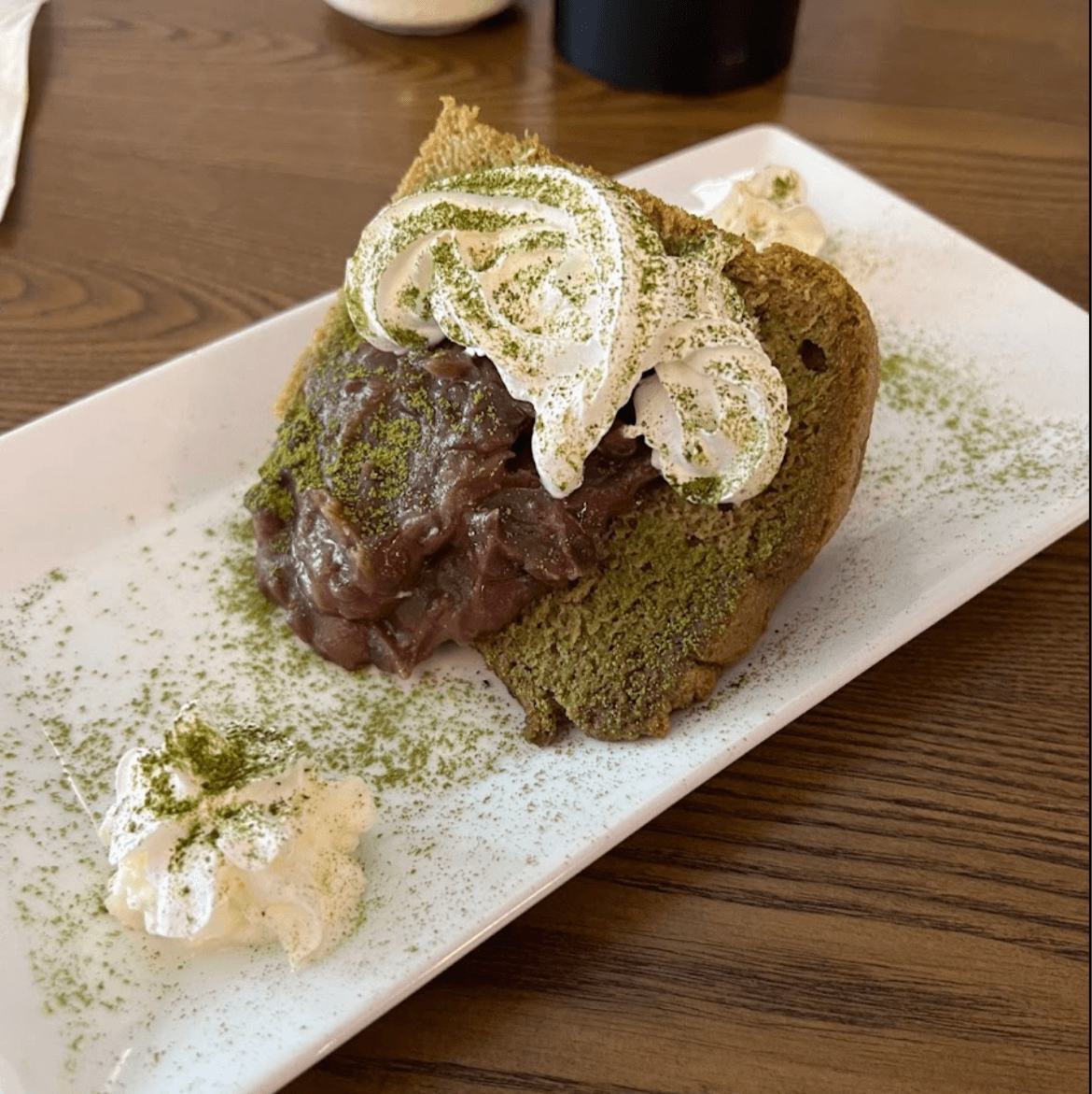 Spongy Chiffon Cake, garnished with whipped cream, red bean paste, and powdered sugar