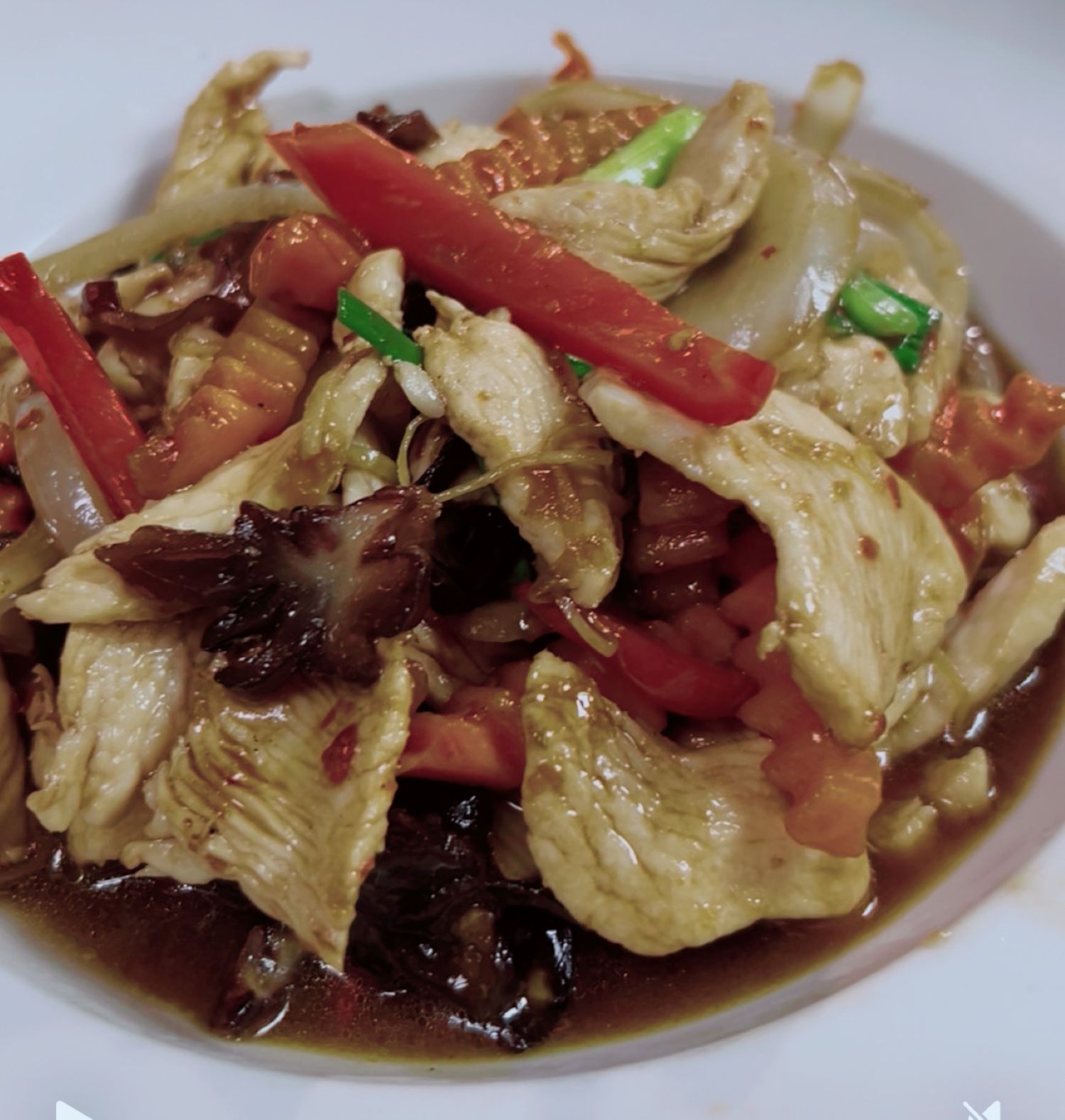 Marinated chicken stir-fried with fresh ginger, pineapple chunk, and scallion, in sweet and sour sauce.