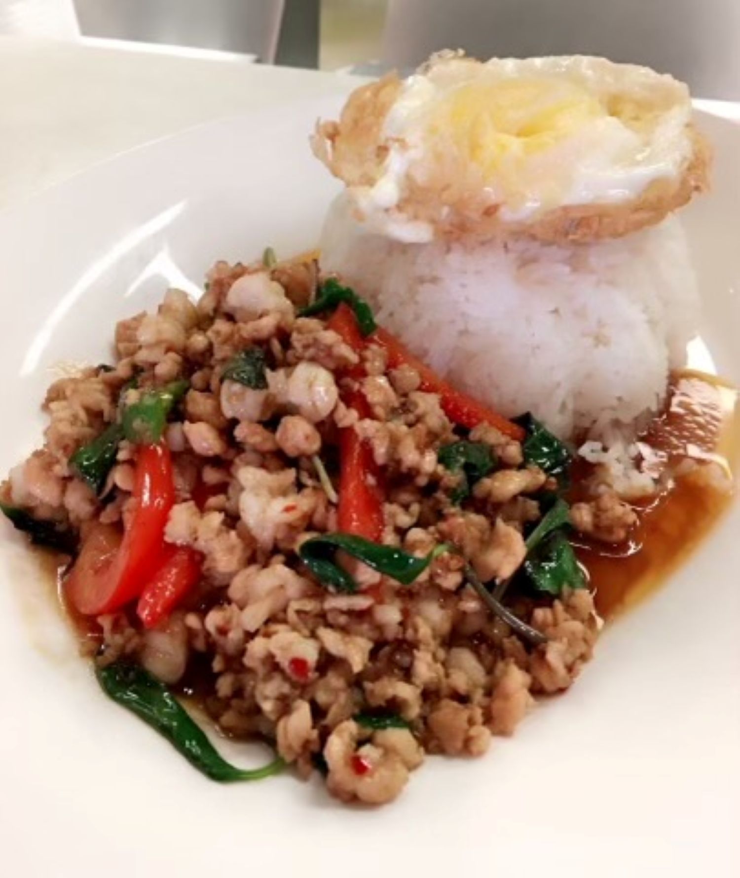Thai street food classic features minced chicken and shrimp stir-fried with fresh garlic, chili peppers, bell pepper, basil leaves in chili basil sauce. Served with steamed jasmine rice and 1 fried egg on top.