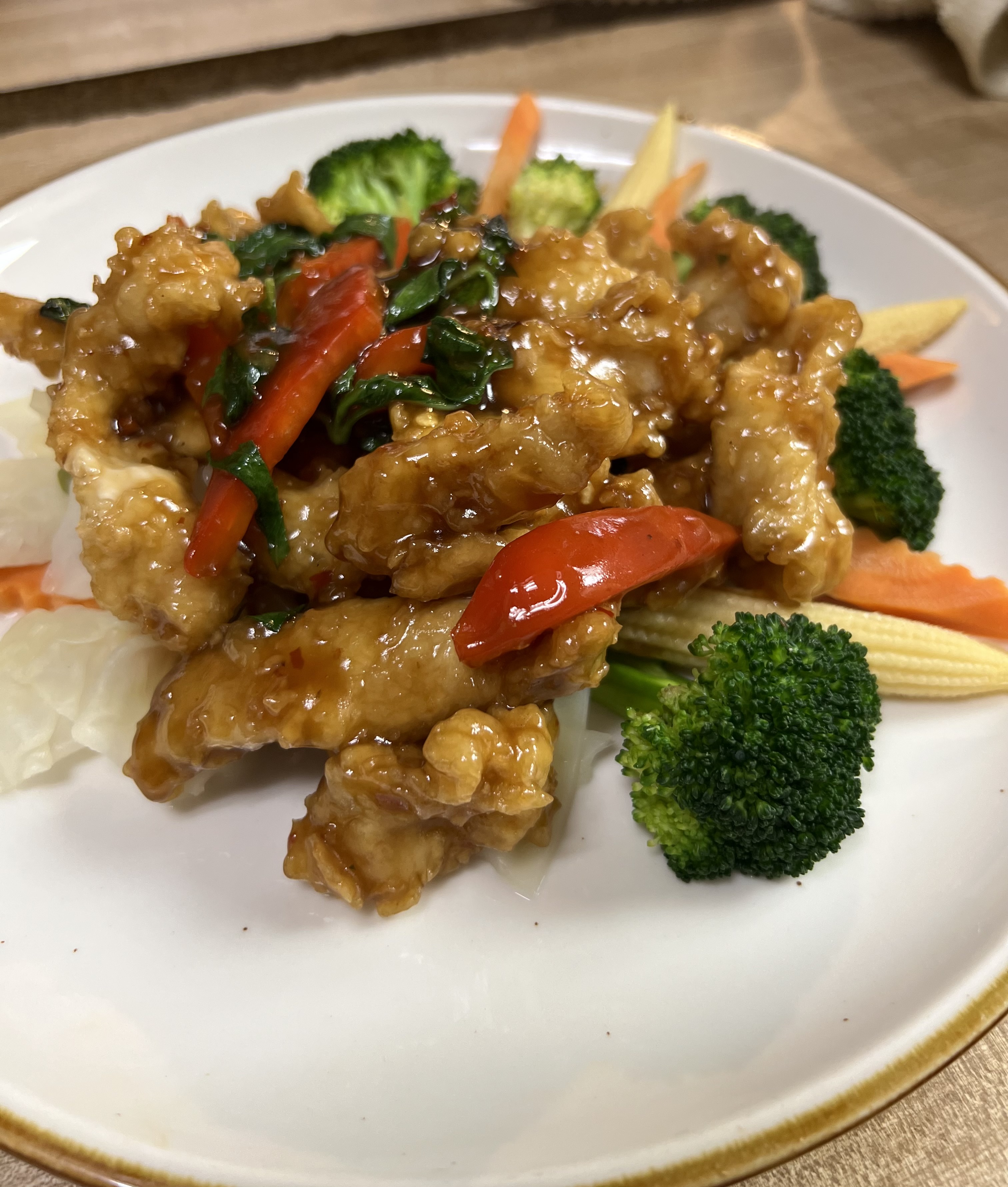 Crispy outer layer chicken breast topped with onion, bell pepper, basil leaves, in chili basil sauce. Served with steamed mixed veggies and steamed jasmine rice.