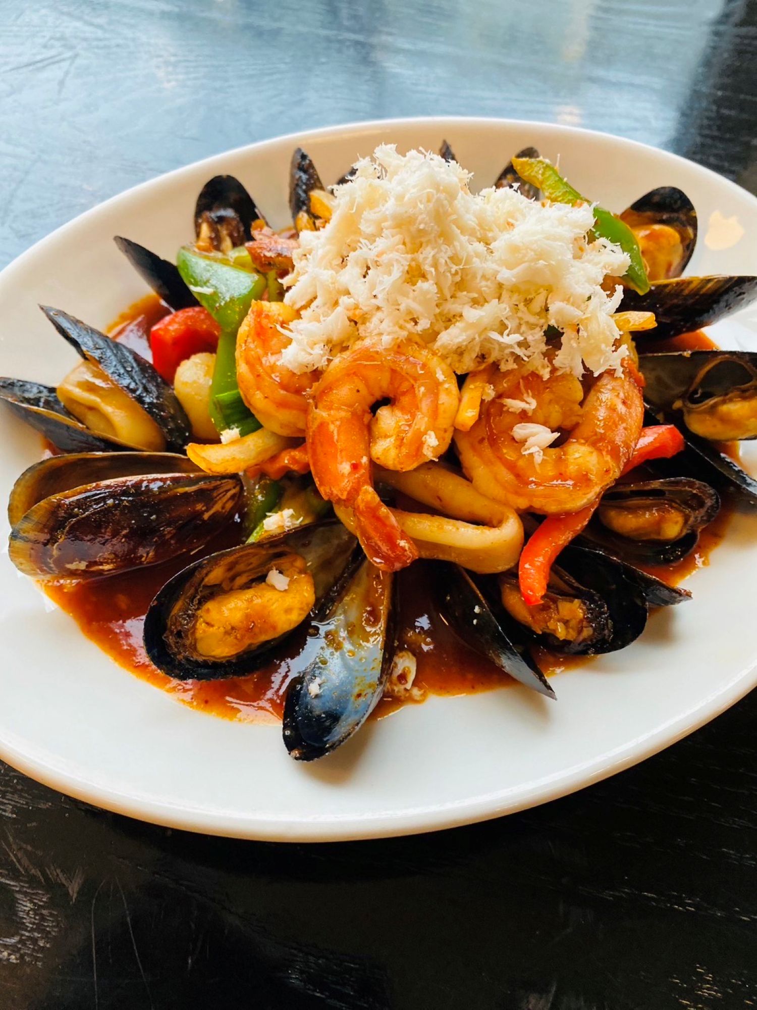 Sauteed shrimp, squid, scallop, mussel lump crab meat, bell peppers, and basil leaves. Served with steamed jasmine right.