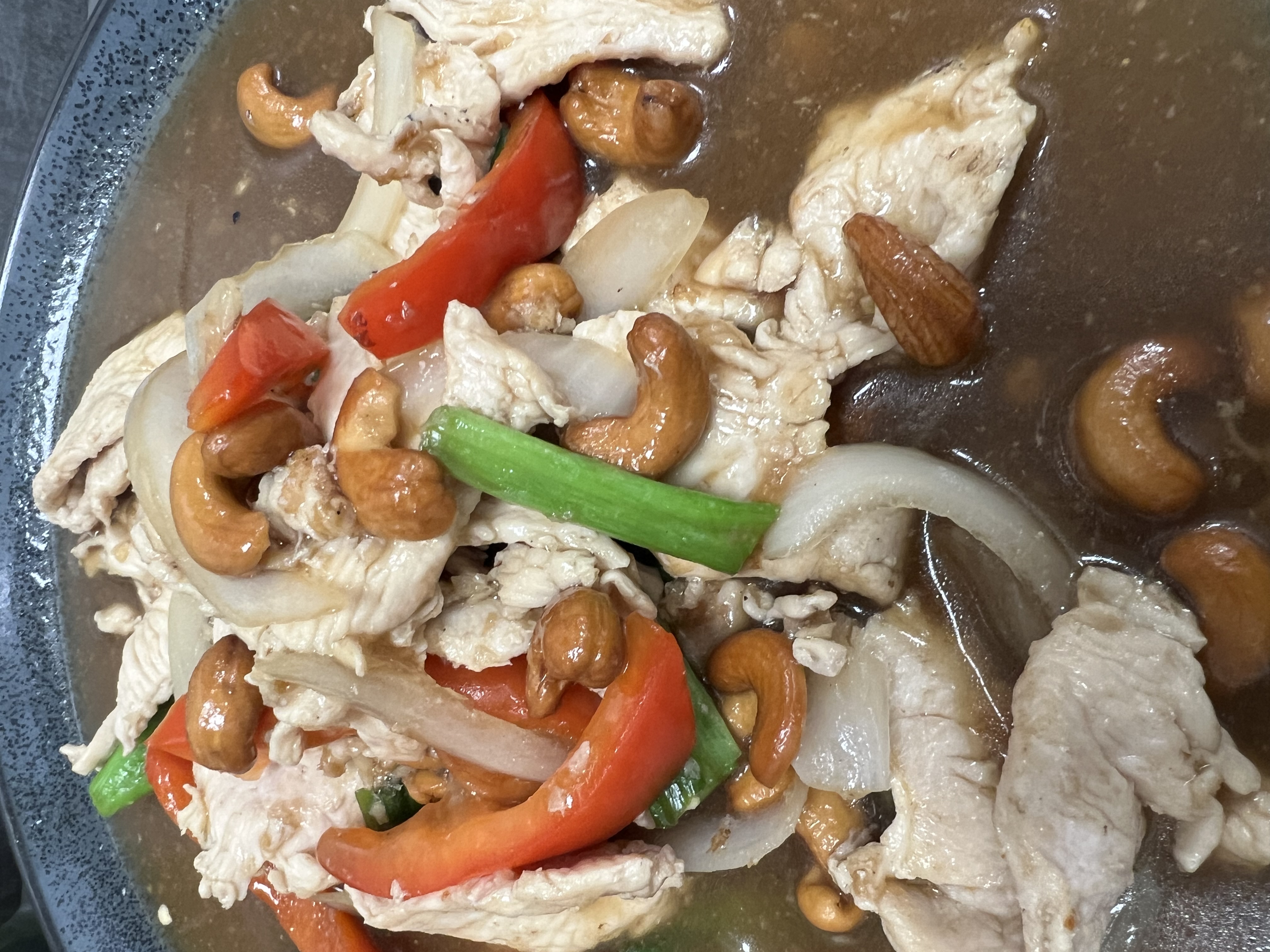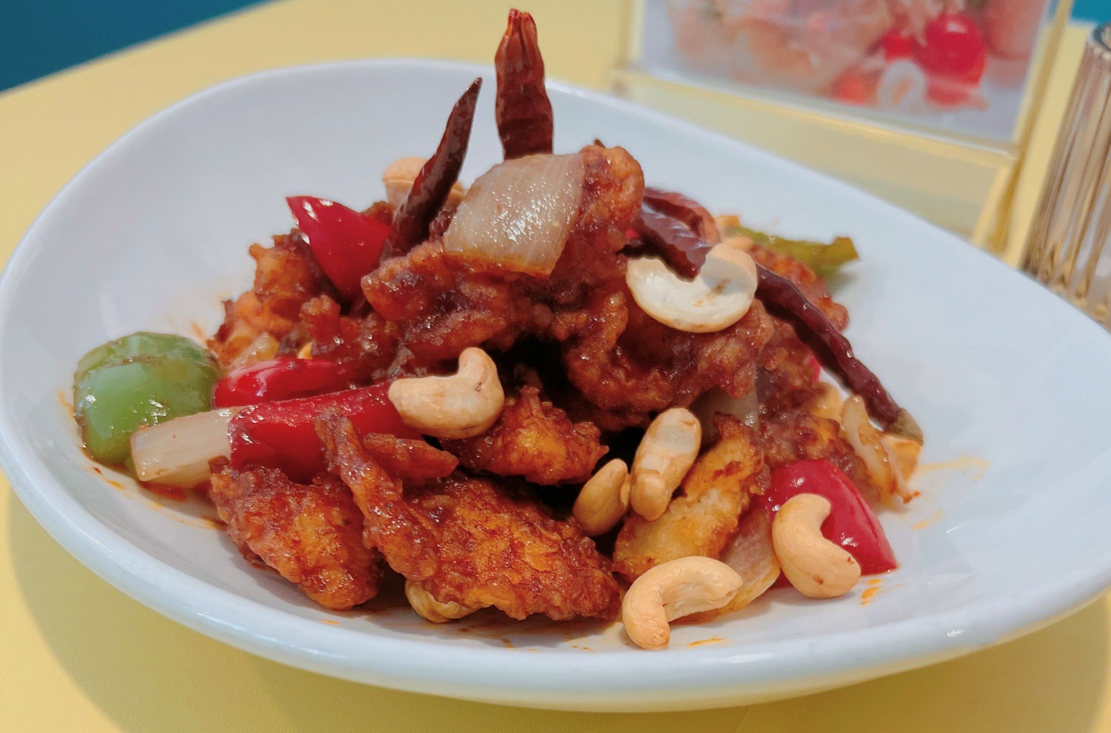Stir-fried crispy chicken with cashew nuts, roasted Thai chili paste, onions, and bell peppers in a savory-sweet sauce. Mild spicy.