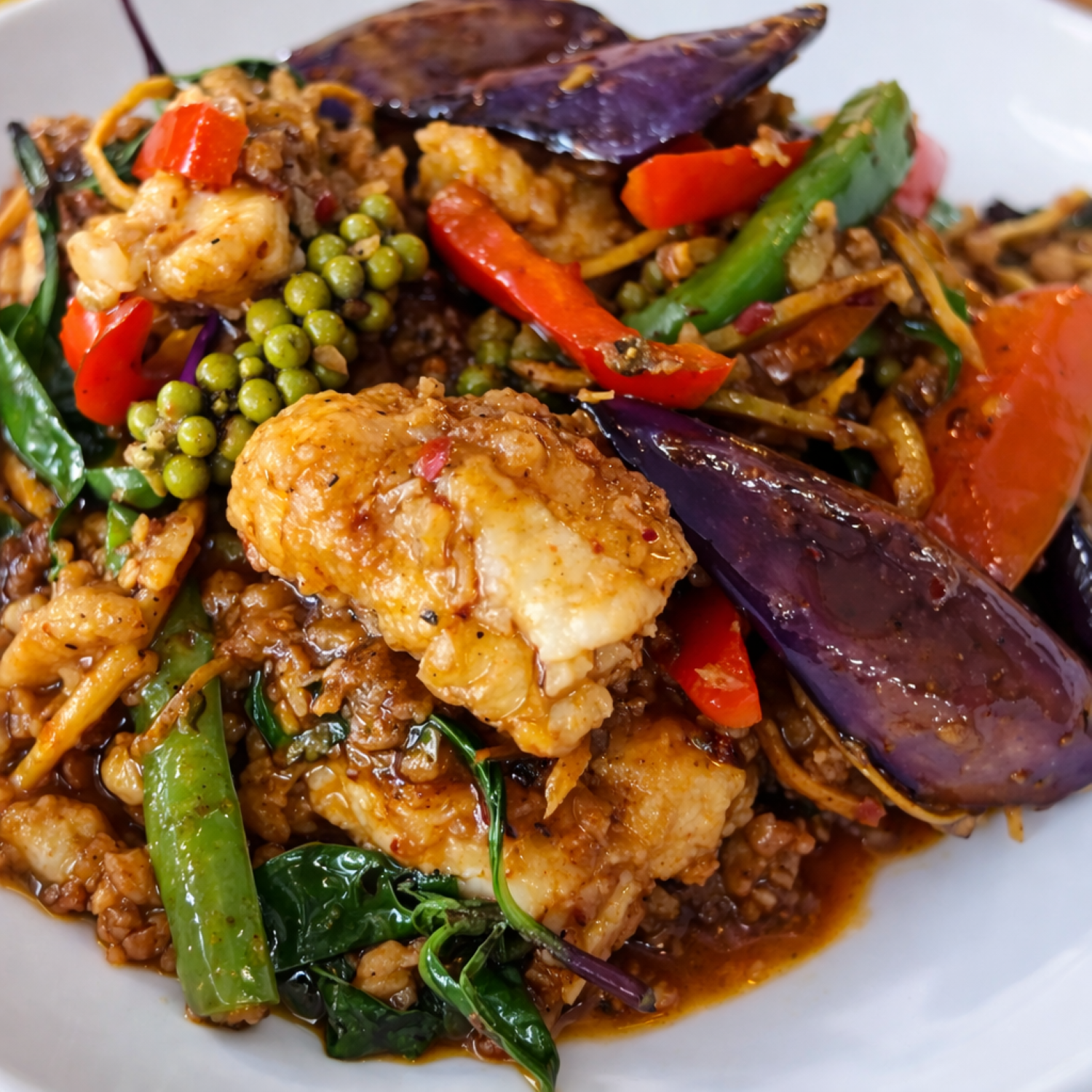 Stir-fried catfish filet with exotic Thai herb, string beans, rhizome, young peppercorn, bell pepper and roasted Thai chili paste. Served with steamed jasmine rice.