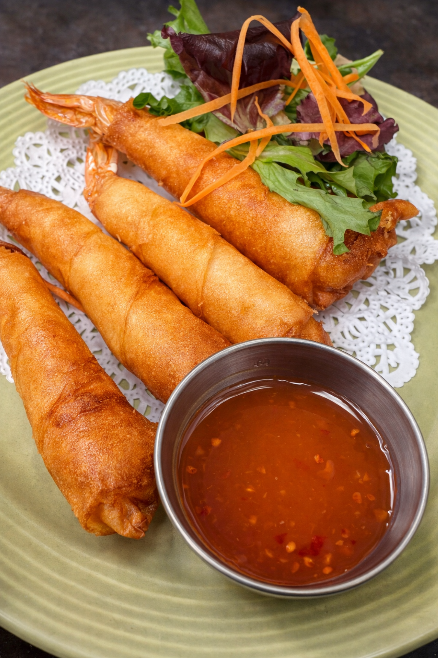 Deep fried shrimp in spring roll wrapper, served with sweet & sour sauce.