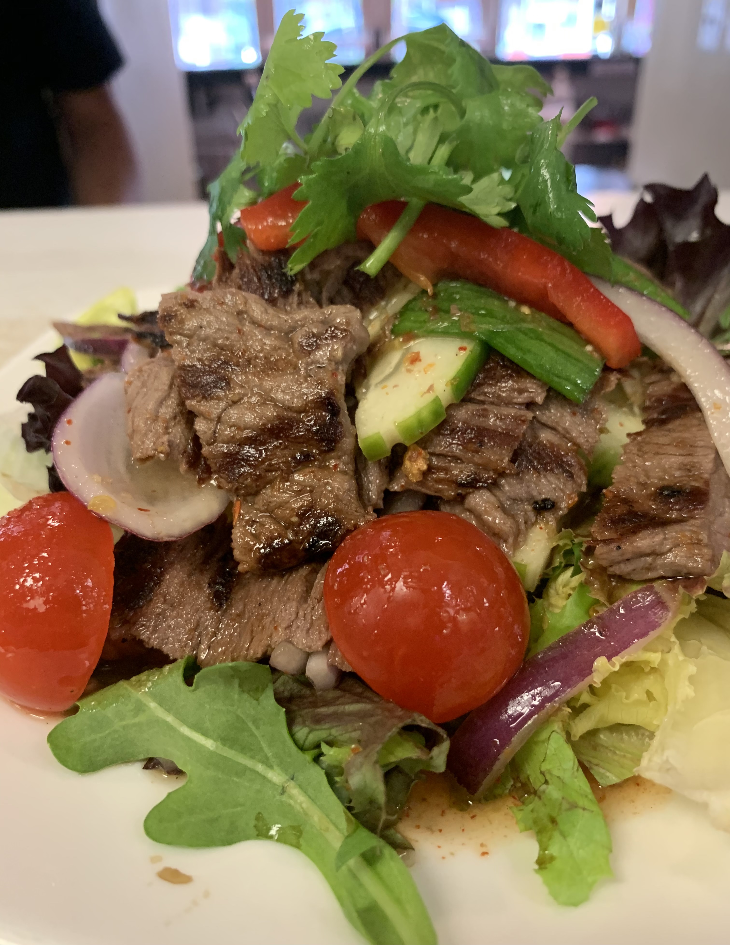 Grilled sliced flank steak tossed with red onion, tomato, scallion and cilantro, and mixed green in spicy lime dressing.