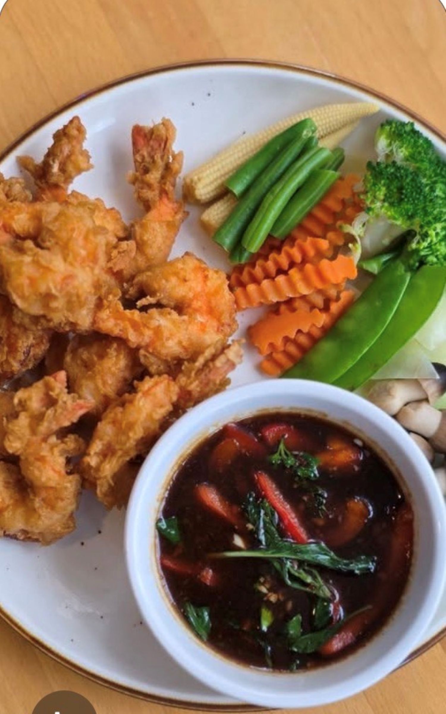 Crispy fried shrimp topped bell peppers, basil leaves in chili basil sauce. Served with steamed vegetables and steamed jasmine rice.