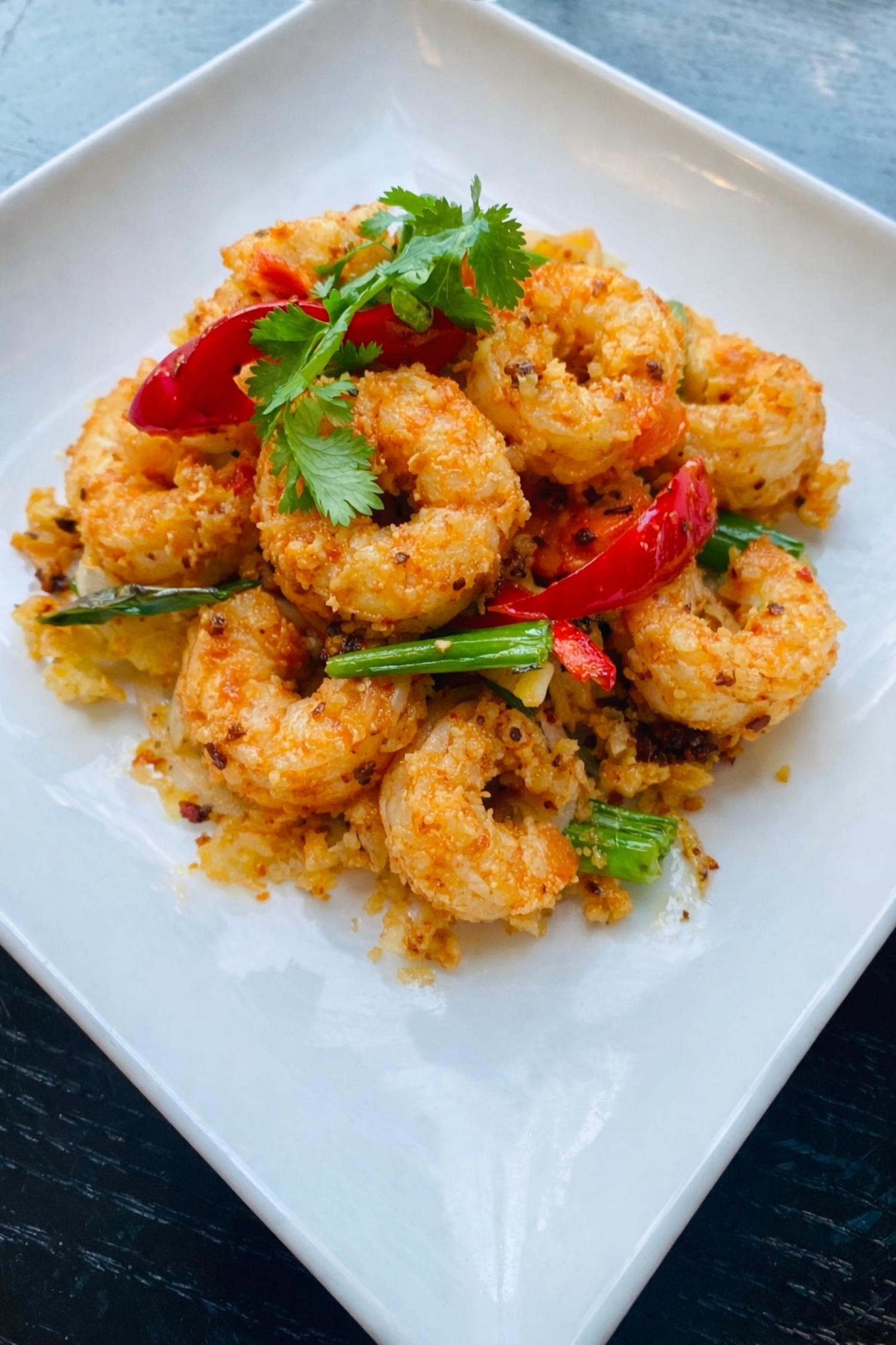 Crispy fried shrimp stir-fried with spicy chili peppers, garlic, scallions and seasonings.