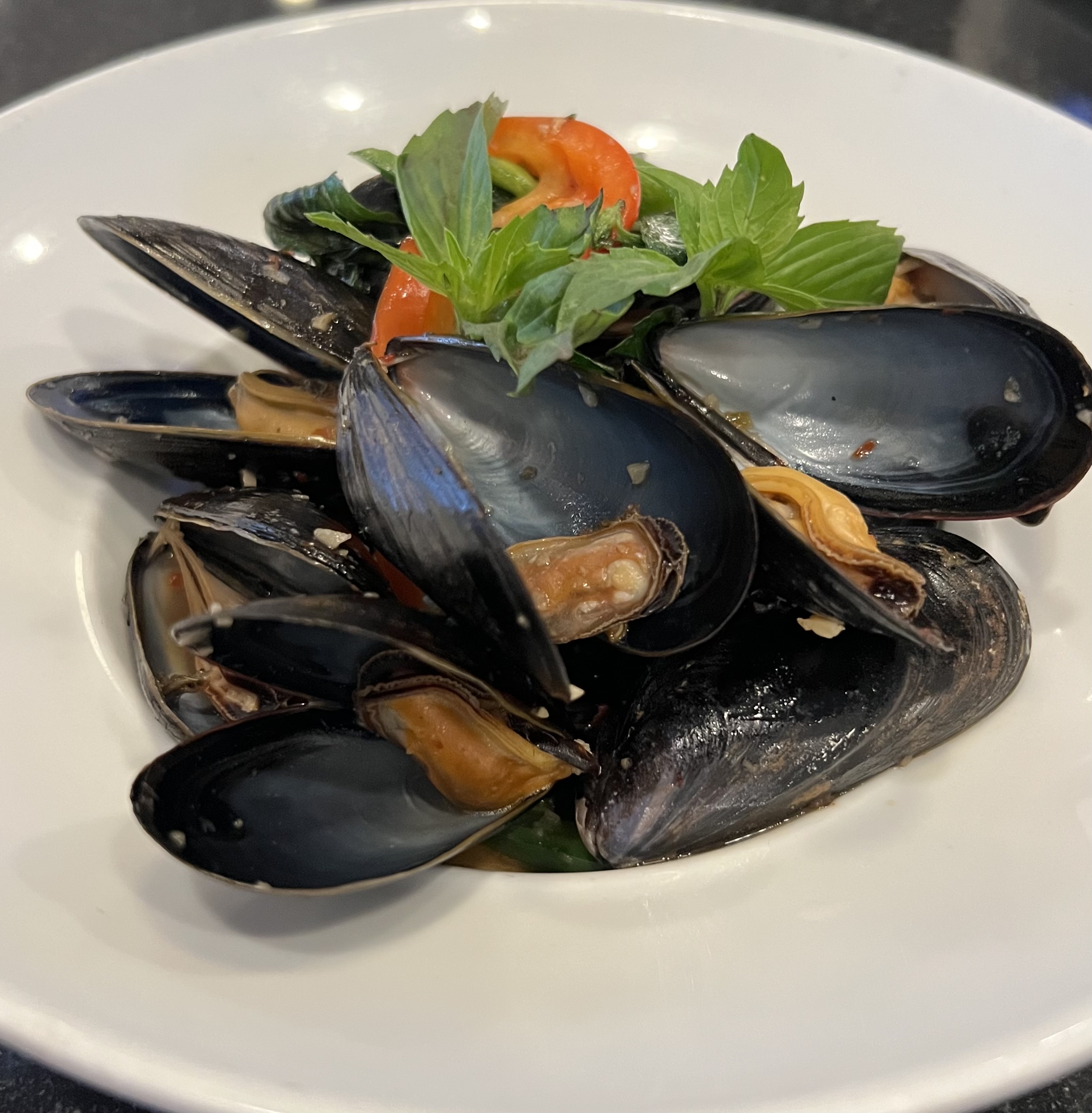 Stir-fried steamed mussels with bell peppers in chili basil sauce.
