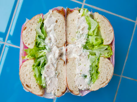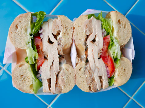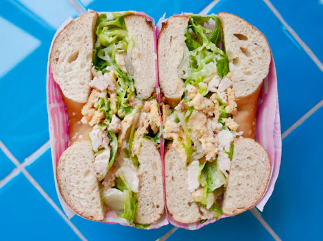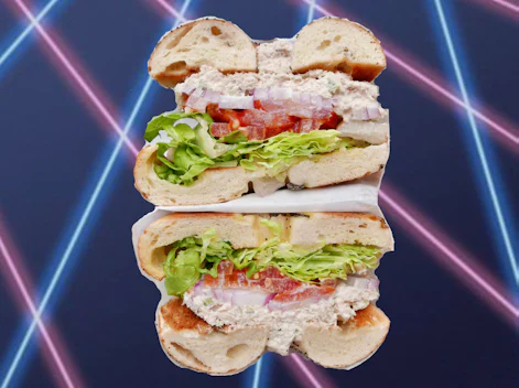A double portion of grilled chicken, lettuce, tomato, red onion, Duke’s™ mayo, on Plain Bagel.
