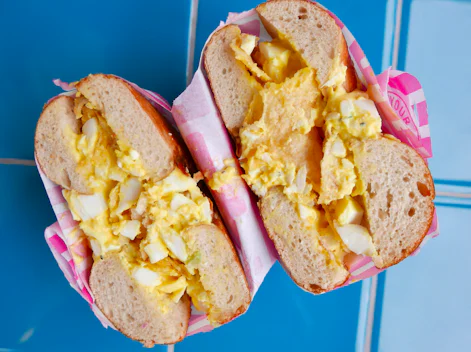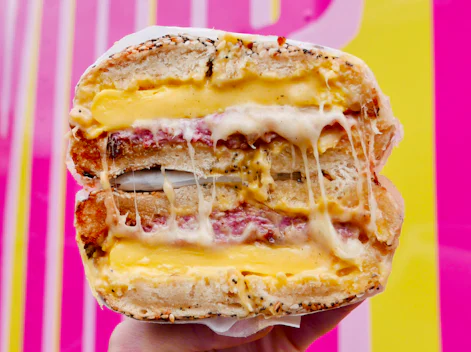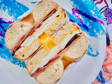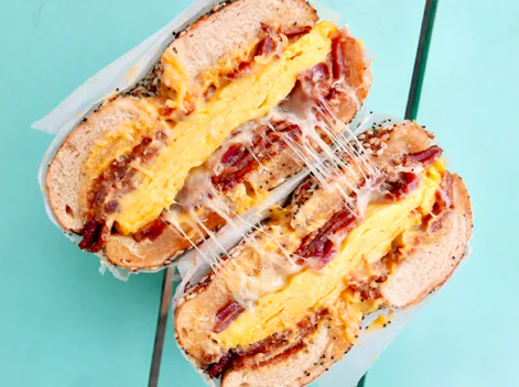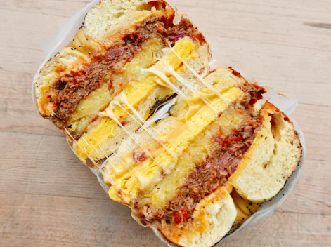 Pastrami, Bodega-style Eggs, American & Cheddar Cheeses, Spicy Honey on an Everything bagel.