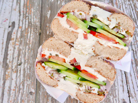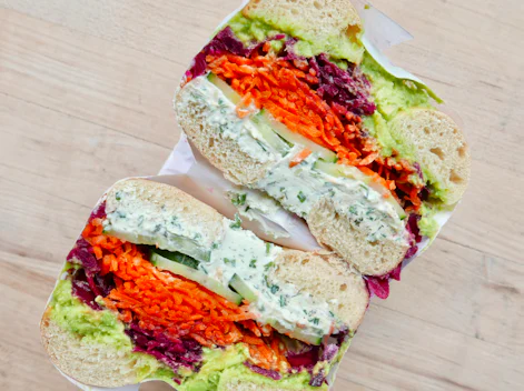 Mashed avocado, Garlic-Herb cream cheese, Cucumber, Pickled veggies, Shredded carrots on a Plain bagel.