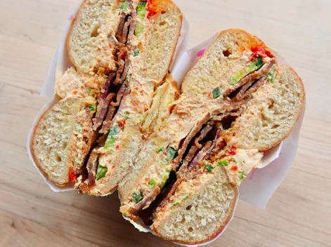Bacon, Lettuce, Tomatoes, Mashed Avocado, Jalapeño-Herb Mayo on Plain bagel.