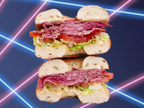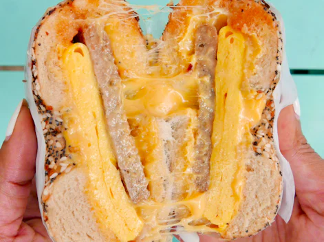 Impossible™ sausage, Bodega-style Eggs, American & Cheddar cheeses, Spicy Honey on an Everything bagel.