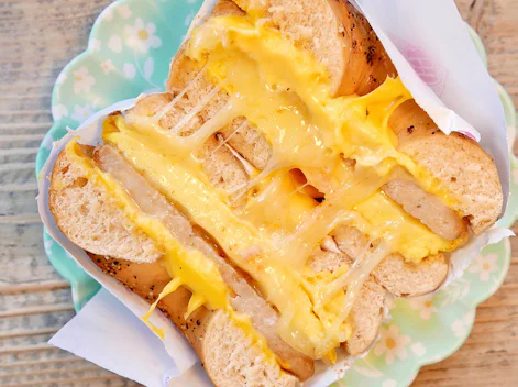 Create your own melty bagel sandwich with your choice of protein like bacon, eggs, or sausage with the option to add melted cheese! Starting at $2.70.