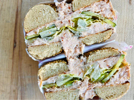 Our Tuna Salad with melted American and Cheddar Cheeses on Everything bagel.