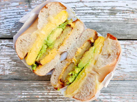 Bodega-style Egg, Latke, American + Cheddar Cheeses, Mashed Avocado on a Plain bagel.