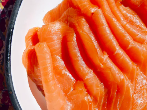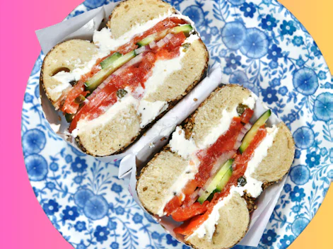 Smoked salmon, mashed avocado, Korean-marinated cucumber, seaweed flakes and carrots on a Sesame bagel.