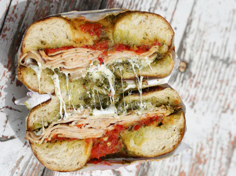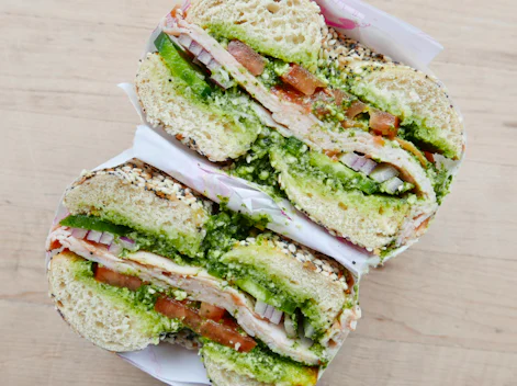 Roasted Turkey, Fresh Mozzarella, Pesto* and Red Pepper Relish, melted on a Plain bagel. *Pesto contains dairy, pesto does NOT contain pine nuts.