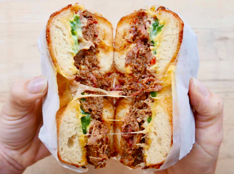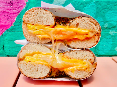 Pastrami/Brisket, American + Cheddar Cheeses, Sofrito, Jalapeño, melted on a Cheddar bagel.
