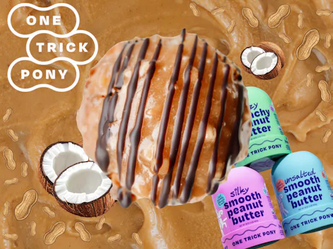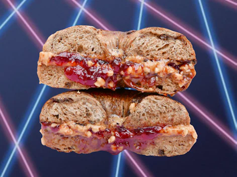 A first class ticket to nostalgia-ville. One Trick Pony™ peanut butter, strawberry jam, on a Cinnamon Raisin Bagel.