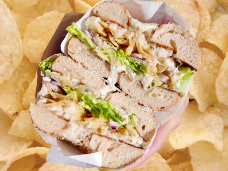 Whitefish salad, red onion, lettuce and potato chips on a Sesame bagel.