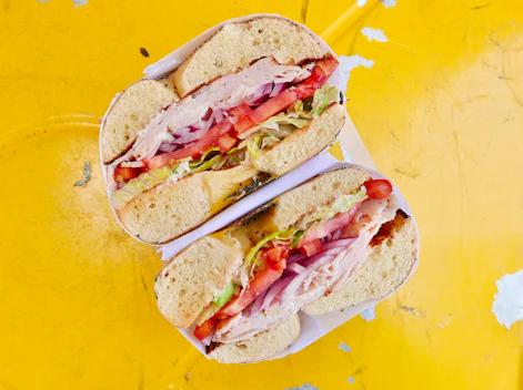 Turkey, Lettuce, Tomato and Red Onion, Duke's Mayo on Plain bagel.