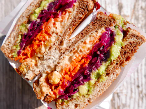 Hummus, Mashed Avocado, Pickled Veggies, Shredded Carrots and Crispy Chickpeas on Rye.