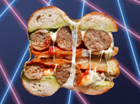 Everything you love about a classic meatball sub, flipped on its head! Meatballs, fresh mozz, pesto, and spicy honey marinara, on a Cheesy Garlic Bread Bagel.