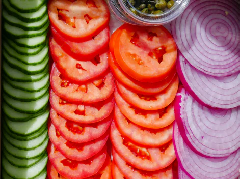 This veggie box for 4 comes with: sliced red onion, cucumbers, tomatoes, and capers.